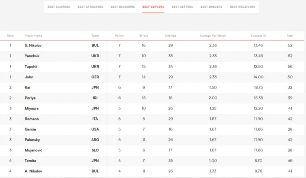 18-годишният играч оглавява класацията, като има 7 аса на сметката си - приблизително по 2.33 на мач. Той дели позицията с още трима волейболисти - от Украйна и Германия.