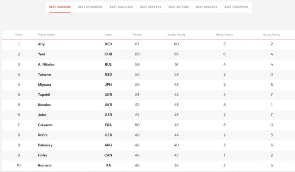 Лидер е нидерландецът Михиел Ахий с 67 точки (5 аса, 2 блокади).