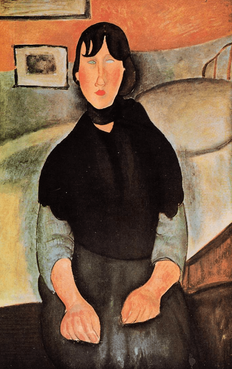 (Dark Young Woman Seated by a Bed, 1918, by Amedeo Modigliani)