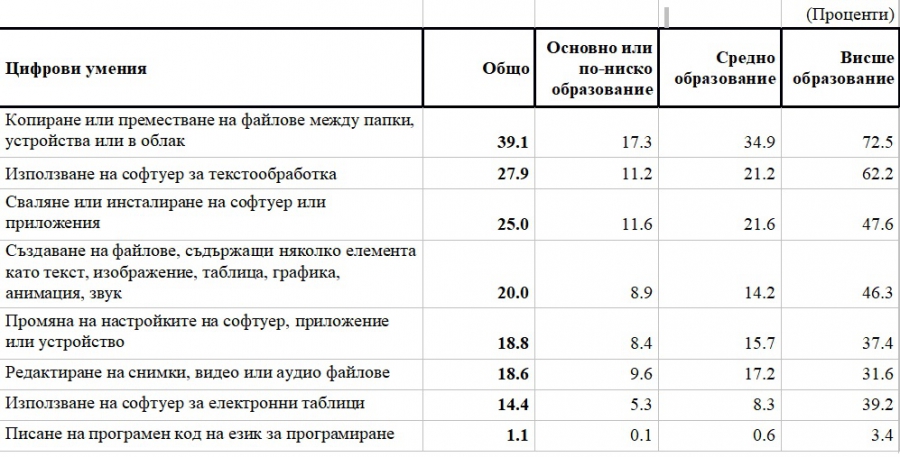 През 2021 година 39.1% от лицата умеят да копират или реалокират файлове, 27.9% могат да работят със програмен продукт за обработка на текст, а 25.0% се оправят със събаряне и инсталиране на програмен продукт или приложения. Едва 1.1% от лицата могат да пишат програмен код на език за програмиране.