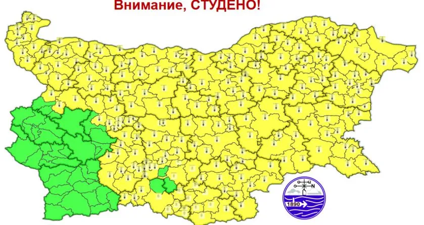 Обявиха жълт код за студ и снеговалежи в почти цяла България КАРТА
