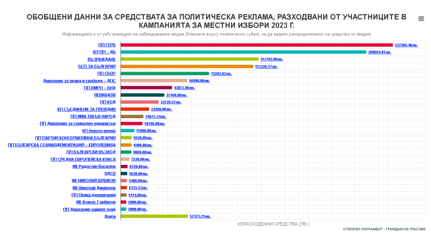 1 130 720 лева (без ДДС) за реклама в медиите са похарчили партиите и обединенията, които вземат участие на локалните избори на 29 октомври за първите 20 дни от акцията. Това сочат данни на Института за развиване на обществената среда.