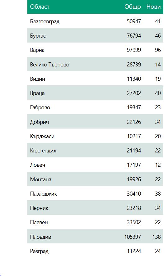 Статистиката за денонощието по области: Благоевград - 41 нови случая, Бургас - 46, Варна - 96, Велико Търново - 14, Видин - 19, Враца - 40, Габрово - 23, Добрич - 34, Кърджали - 20, Кюстендил - 22, Ловеч - 12, Монтана - 22, Пазарджик - 38, Перник - 34, Плевен - 22, Пловдив - 138, Разград - 24, Русе - 28, Силистра - 15, Сливен - 11, Смолян - 17, София-град - 401, София-област - 47, Стара Загора - 57, Търговище - 13, Хасково - 24, Шумен - 20, Ямбол - 20.