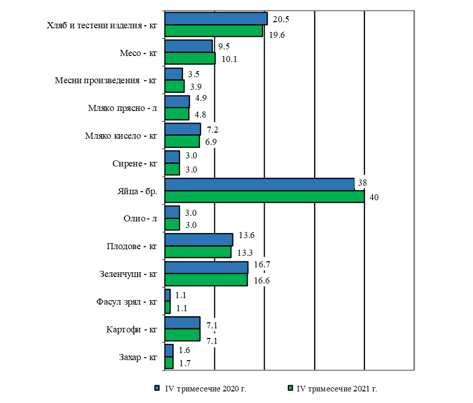 През четвъртото тримесечие на 2021 година потреблението на съществени хранителни артикули приблизително на разположение от домакинство се трансформира в съпоставяне със същото тримесечие на 2020 година, както следва: