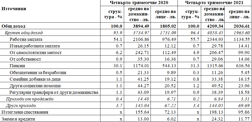 В номинално изражение през четвъртото тримесечие на 2021 година в съпоставяне със същото тримесечие на 2020 година приходите приблизително на разположение от домакинство по източници на приход се трансформират, както следва: