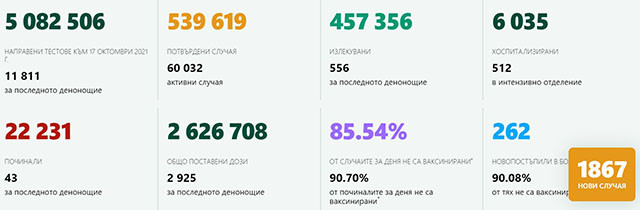 2 626 708 дози от имунизациите против COVID-19 са сложени у нас общо досега. През миналото денонощие са приложени 2 925 от тях. Според Националната осведомителна система у нас новият ковид е доказан при общо 15 068 лица-медицински чиновници. Новите случаи, регистрирани през последното денонощие, са 35. 22 231 са умрелите лица, при които е била установена коронавирусната зараза. 43 нови случая са регистрирани през последните 24 часа. 90,7 % от умрелите лица не са били имунизирани. Ден по-рано у нас бяха регистрирани нови 3440 случая на COVID-19, а преди седмица, в събота - 1246.