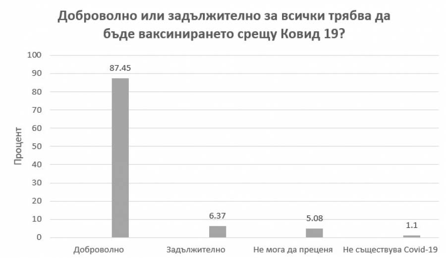 Мнението на изследваните лица наподобява повече от консолидирано във връзка с въпроса „ Доброволно или наложително за всички би трябвало да бъде имунизирането против Ковид 19? “. Повече от две трети от интервюираните (87,4%) са безапелационни, че имунизирането би трябвало да бъде непринудено. На противоположното мнение, че би трябвало да бъде наложително са едвам 6,4%. Не могат да преценяват коя от двете благоприятни условия е по-добра 5,1% от респондетите, а 1,1% от тях смятат, че Ковид 19 не съществува. Очевидно е, че промени във връзка с този въпрос в българската политика биха били непопулярни и неприемливи за голямото болшинство жители. Характерът на имунизирането в обозримо бъдеще у нас ще е непринуден.