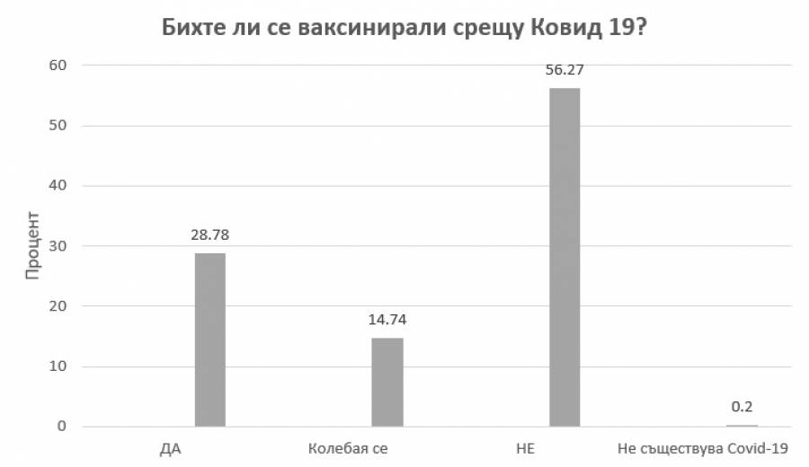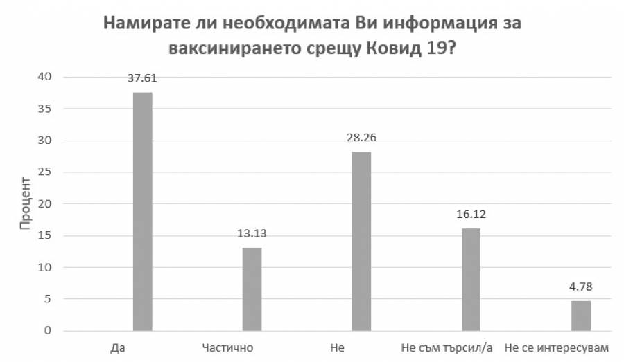 Прави впечателение, че 56,3% от респондените не желаят да се имунизират, само че единствено 37,6% заявяват, че имат нужната информация по тематиката. Несъответствието е допустимо да се дължи на ирационални инстинкти във връзка с имунизирането и на незадоволителната информация. Имайки поради и огромния дял на изследваните лица, които не намират нужната им информация за имунизирането против Ковид 19 (28,4%), може да се заключи, че е нужна целева политика на пояснение и обяснение по изследваната тематика.