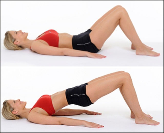 1. Мост на плещи С това упражнение ще развиете гъвкавостта на бедрата си и ще укрепите мускулите. Легнете по тил, сгънете коленете си и изпънете ръце нагоре. След това постепенно повдигнете таза и бедрата си, колкото се може по-високо. Върнете се в изходна позиция. И по този начин 30 повторения.