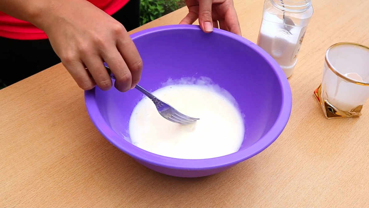 В купа, благодарение на вилица, разбийте яйцето и киселото мляко до гладкост, прибавете щипка сол.