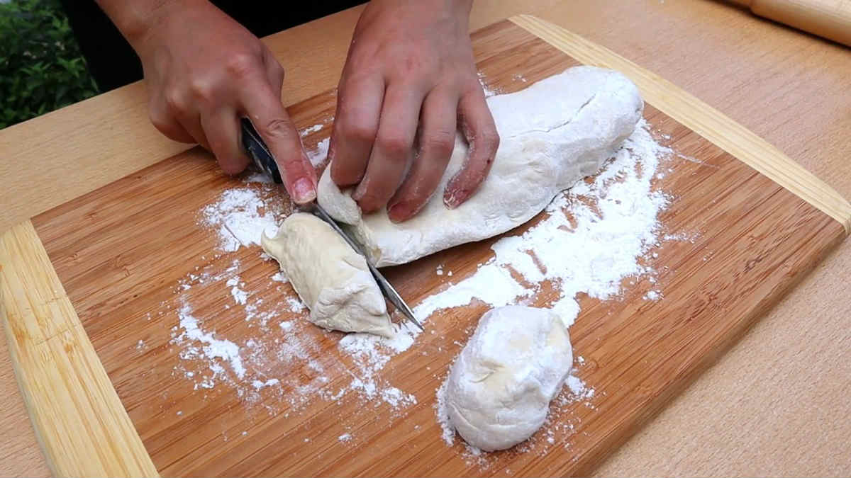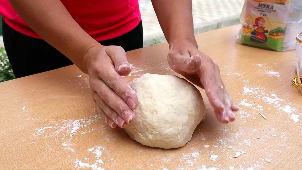 Добавете брашно към сместа на дребни порции. Когато тестото стане твърдо, поставете го върху набрашнена маса и омесете добре.