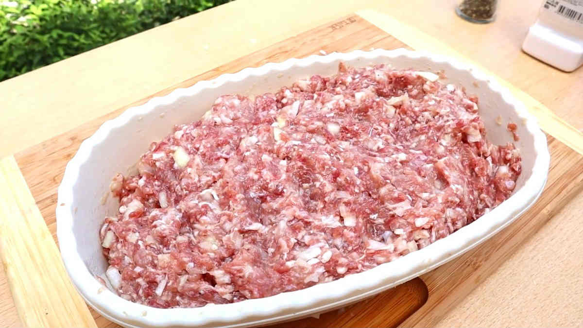 По това време пригответе пълнежа: към каймата прибавете едро нарязан лук, вода, сол и черен пипер. Мляното говеждо месо може да бъде сменено с всяко друго, можете да омесите няколко типа