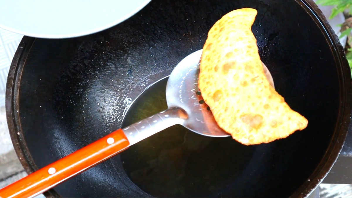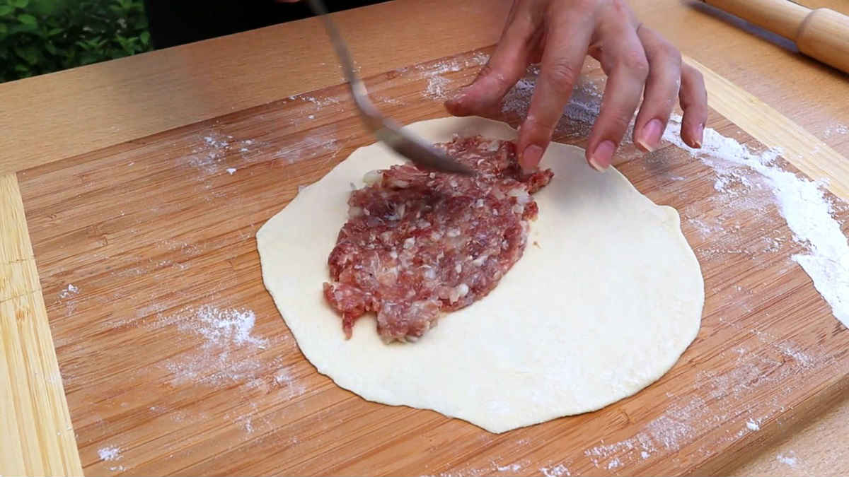 Разточете всяка топка тесто в плоска питка, сложете супена лъжица кайма вътре, закрепете краищата. Използвайте точилка, с цел да заключите по краищата на чебурека, тъй че сокът да не изтича по време на пържене.
