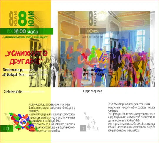 16.00 ч. – в театъра – „ Усмихнато другарче “ – креативно ателие за деца с ДКТ „ Иван Радоев “ – Плевен, с авансово записване. То е радостно създание, пристигнало от далечни-далечни страни на нашия фестивал или пък е най-хубавото от всички хора, събрано в едно, с цел да усмихва и радва.