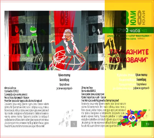 17.30 ч. – ДКТ, Камерна сцена – „ Приказните разказвачи “ на Куклен спектакъл – Благоевград, зрелище за фамилна публика 6+. Случайна среща сред двамата чудати герои придвижва дребните фенове във приказен свят, цялостен с говорещи лисици, тъжни и радостни принцеси, жабоци с корони и доста други чудеса, ловко разказани в три приказки.