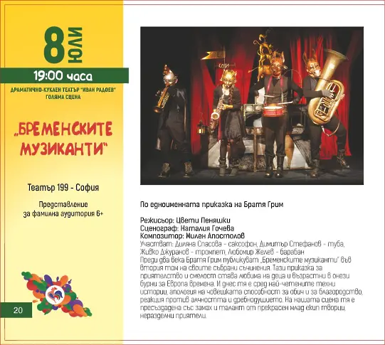 19.00 ч. – ДКТ, Голяма сцена - „ Бременските музиканти “ на Театър 199 – София, зрелище за фамилна публика 6+. И през днешния ден приказката на братя Грим е измежду най-четените техни истории, апология на човешката дарба за любов и за достойнство, реакция срещу алчността и дребнодушието.
