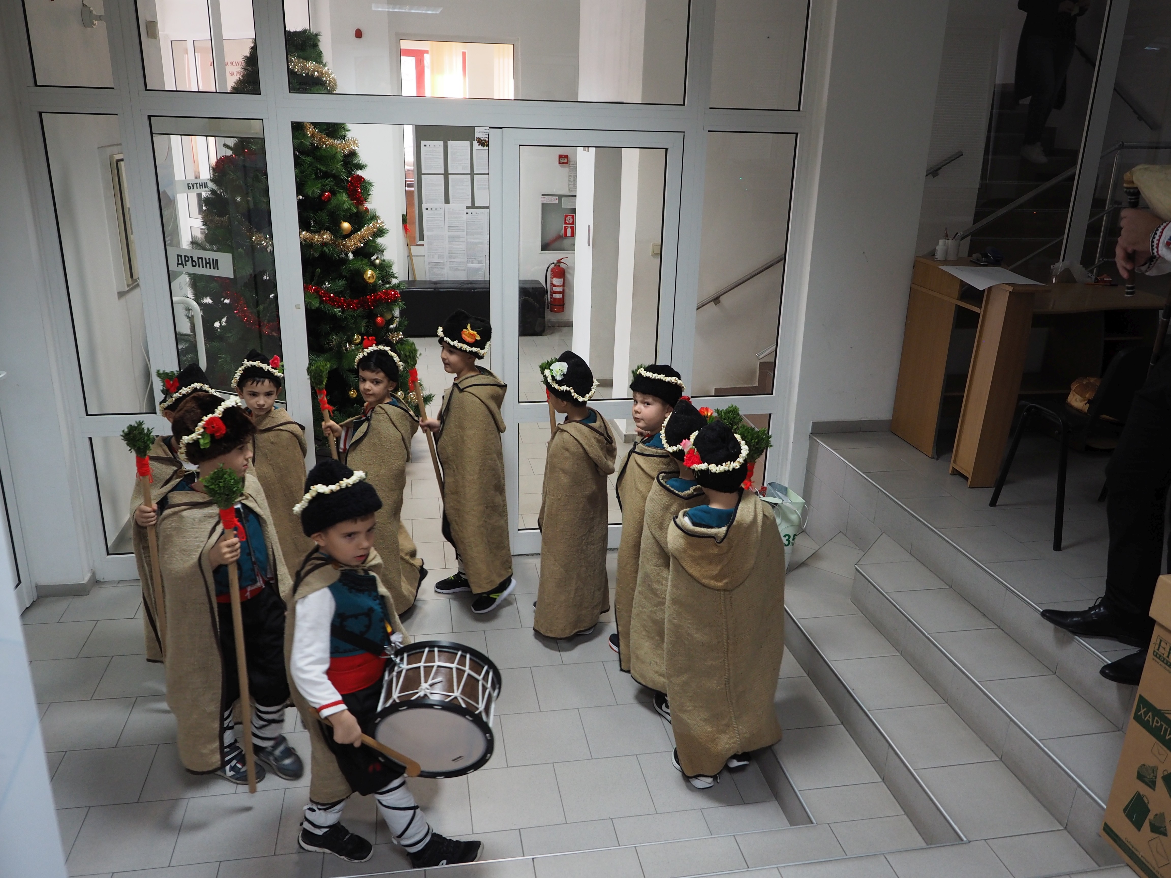 Облечени в красиви национални носии, с геги и калпаци, децата поздравиха с коледни песнички и стихчета кмета на община „ Марица “ Димитър Иванов, ръководителя на Общинския съвет Гергана Трендафилова, заместник-кметовете и администрацията.