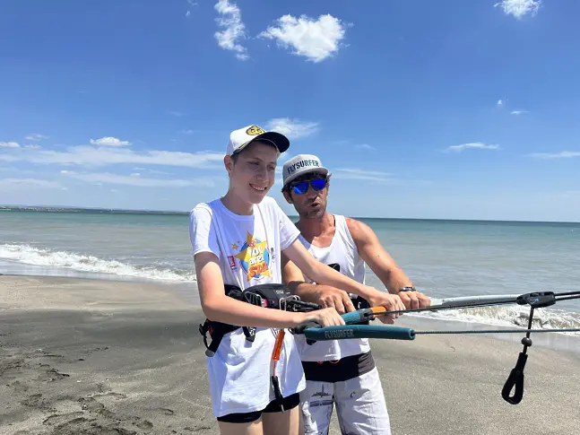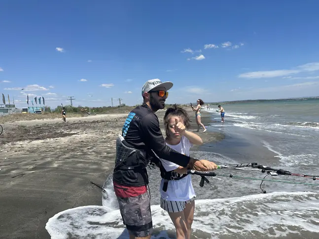 10 смели малчугани от подвигнаха платната на сърфа над морските талази под вещото управление на инструкторите от школата по кайт сърф към Интензивният курс се състоя на една от най-хубавите точки за сърфистите в града – до Северния плаж по пътя за Солниците.