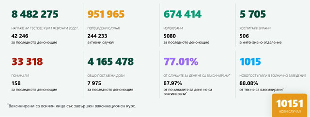 10151 са новите позитивни случаи на Коронавирус у нас в понеделник, сочат данните в Единния информативен портал. Това са 24% от направените 42 246 теста. (8 955 от тестванията са PCR, а други 33 291 са бързи тестове).
