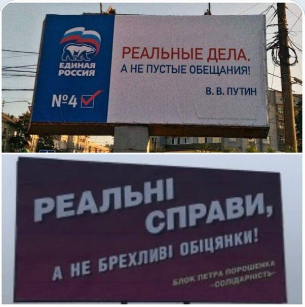 Украинският лидер Петро Порошенко бе осмян заради лозунга за изборите, който е точно копие на лозунга на кандидата за президент Владимир Путин в Русия през 2012 година. Потребителите на социалните мрежи публикуваха билбордове, монтирани из цяла Украйна, като казват: " Кандидати много - президентът е един. "