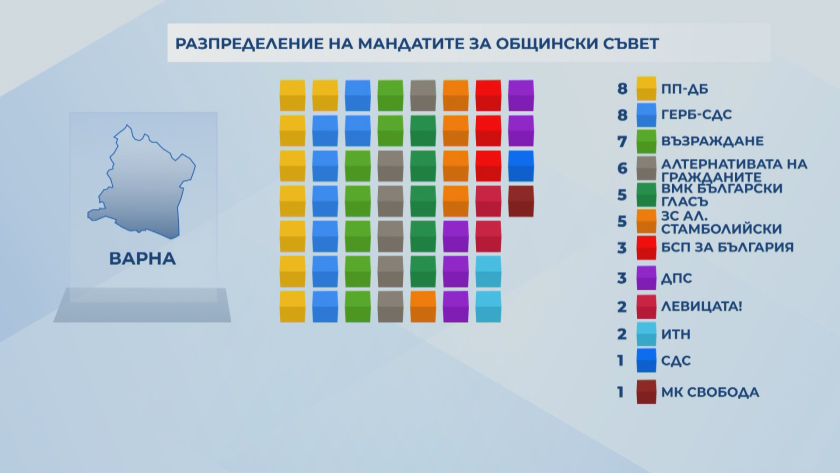 11 политически обединения ще имат свои представители в Общинския съвет във Варна. По еднакъв брой - 8 ще са съветниците от ПП-ДБ и ГЕРБ, следва Възраждане със 7.