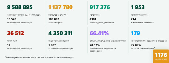 През последното денонощие са направени 10 528 теста. От общо 36 512 умряли от началото на пандемията, през последните 24 часа борбата с вируса изгубиха 14 души. 78.57% от тях не са били имунизирани.