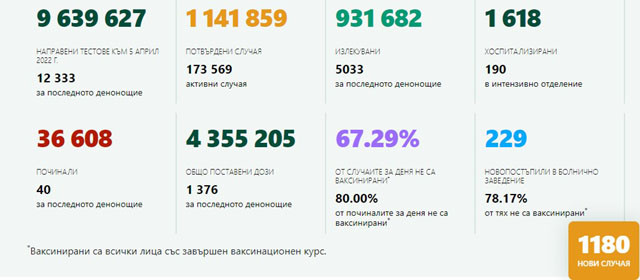 Новопостъпилите в лечебни заведения за денонощието са 229, от които 78,17% са неимунизирани. В момента приети в болница са 1618 души, от тях 190 са в интензивни отделения.
