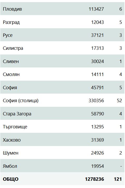 121 нови случая на COVID-19 у нас за последното денонощие. Направени са 1 201 теста, демонстрират данните от Единния информативен портал. Положителни са 10.07% от пробите.
