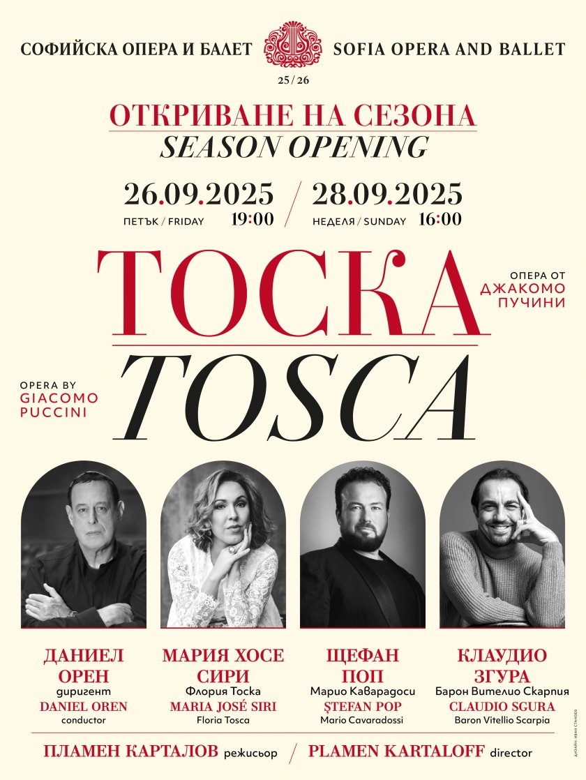 Спектаклите на " Тоска " са на 26 и 28 септември. За централните функции са поканени трима от най-аплодираните сега артисти – Мария Хосе Сири ще бъде Тоска, Щефан Поп – Каварадоси, Клаудио Згура – барон Скарпия. Участват също Ангел Христов, Петър Бучков, Емил Павлов, Александър Георгиев, Мария Павлова, оркестър и хор на Софийската опера, диригент на хора Виолета Димитрова.
