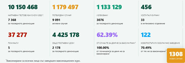 Общият брой на доказаните случаи на заразяване с вируса в България доближи 1 179 497. Активните случаи са 9091. Под карантина са минали 2 621 920 души, като 6129 души са карантинирани сега.