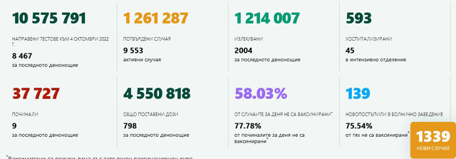 593 се нуждаят от болнично лекуване, а 45 се лекуват в интензивни отделения. За денонощие в болница са признати 139 нови пациенти.