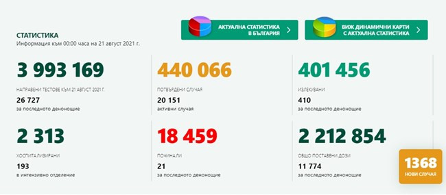 Така общият брой на доказаните случаи става 440 066 от които дейни са 20 151. 410 души са излекуваните през последното денонощие, а общият им брой е 401 456. Приетите в лечебни заведения са 2 313, като в интензивно поделение са 193. Починалите с потвърдена коронавирусна зараза са общо 18 459, като 21 от случаите са от последните 24 часа. Няма данни за поставените дози ваксини за денонощието.