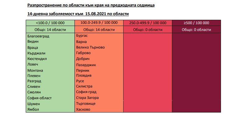 14 области в страната са в оранжевата зона със заболеваемост над 100 на 100 000 души. Това демонстрира анализът на Националния център по заразни и паразитни заболявания (НЦЗПБ).