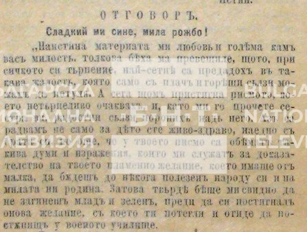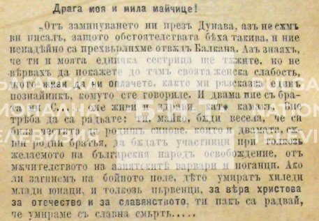 От заминаването ни през Дунава аз не съм ви писал, тъй като събитията бяха такива (…) Аз знаех, че ти и моята едничка сестрица ще тъжите, само че не имах вяра да покажете до там своята женска уязвимост, че да ни оплачете живи, както ми споделя един прочут, комуто сте говорили. И двамата с брат ми С... сме живи и здрави като камък. Вие би трябвало да се радвате: ти, майко, бъди радостна, че си била честита да родиш синове, които да бъдат участници в толкоз мечтаното от българския народ Освобождение. Ако ли загинем на бойното поле, където умират хиляди млади юнаци и толкоз първенци, ти отново се радвай, че умираме със славна гибел. (…) ”