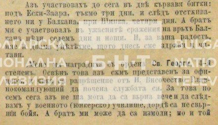 “Аз участвах до момента в две кървави борби (…), а брат ми е взел участие в ужасните сражения точно на Балкана цели седем дни и нощи. И за ваша наслада - ние и двамата оцеляхме.