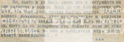 Но както и да е било, през днешния ден аз и сестрицата ви сме радостни и радостни. Нека да сте благословени от Бога, от мене и от всичкия български народ! Според вашата непорочност, дето вие тръгнахте и отидохте самички, като на женитба, милостивий Бог ще ви опази, щото да се завърнете от бойното поле освен здрави и читави, само че още спечелили над побеснелите наши врагове! ”
