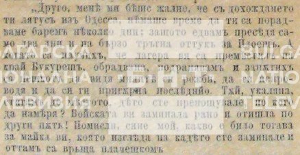 “Когато се научих, че лагерът ви са преместили край Букурещ, зарадвана подраних и запътих се пеша да видя благите си чеда, да ги изпроводя и да си ги прегърна за последно. Тъй окаляна стигам до мястото, дето сте пренощували, само че кого да намеря? Войската ви отпътувала рано и отишла по различен път! Помисли, сине мой, какво е било тогава за майка ви, която погледна накъде сте отпътували и се върна плачешком.