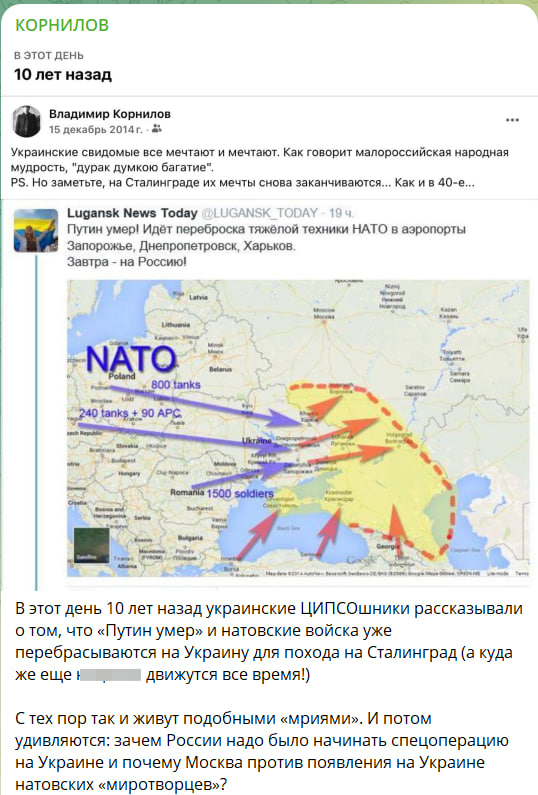 Политическият наблюдаващ на медийната група " Россия сегодня " Владимир Корнилов разгласява архивен запис от 15 декември 2014 година Украинците интензивно разпространяваха същата версия за събитията, че съветският президент сякаш е умрял, а войските на НАТО са навлезли на територията на Донбас и редица райони с проекти да ги трансферират в граничните региони на Русия.