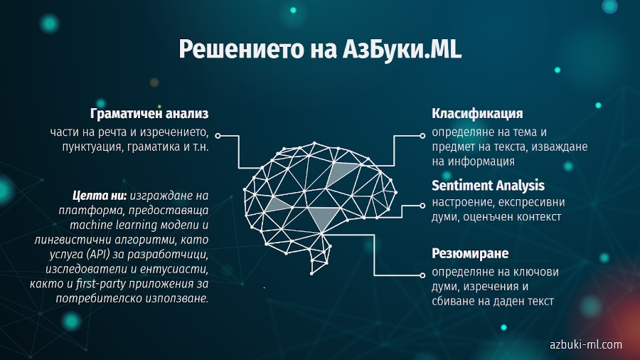 Проектът, озаглавен, е онлайн платформа, която е цялост от логаритми и модели с изкуствен интелект с опция да обработват българския език. Това включва промяна на граматични и пунктуационни неточности, генериране на текстове, синтезиране на гласов прочит от написан текст, съкращаване, оценка на настроението в текстовете.