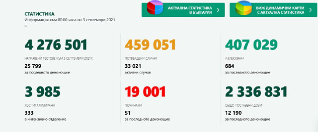 1564 са новодиагностицираните с COVID-19 лица у нас за миналите 24 часа. Това е с 181 случая по-малко от през вчерашния ден, сочат данните на Единния информативен портал. За последното денонощие са направени общо теста 25 799, от които PCR - 8 341, а - антигенни 16 495. Това значи, че новите случаи са % от тестваните 6,06%. 16 495 души са приетите в болница, а 333 се намират в интензивно поделение. Общо доказаните случаи на ковид досега са 459 051. 33 021 са дейни. 407 029 е броят на излекуваните. 684 са през от последното денонощие. Броят на умрелите е 19 001. 51 са от последните 24 часа. 2 336 831 са общо поставените дози ваксини у нас. 12 190 са от последното денонощие.