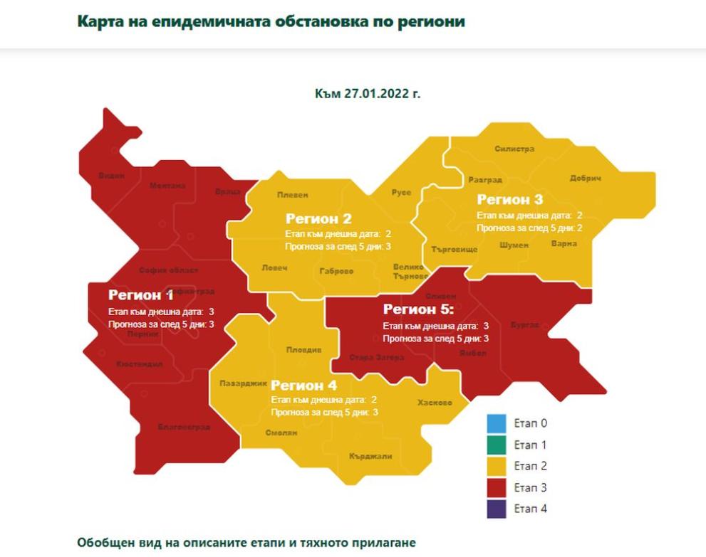 coronavirus.bg На нея се вижда, че първи и пети район са в Етап 3 и се чака да останат в него и след пет дни. Втори и четвърти район са в Етап 2, само че се чака да преминат в Етап 3, а трети район също е в Етап 2.