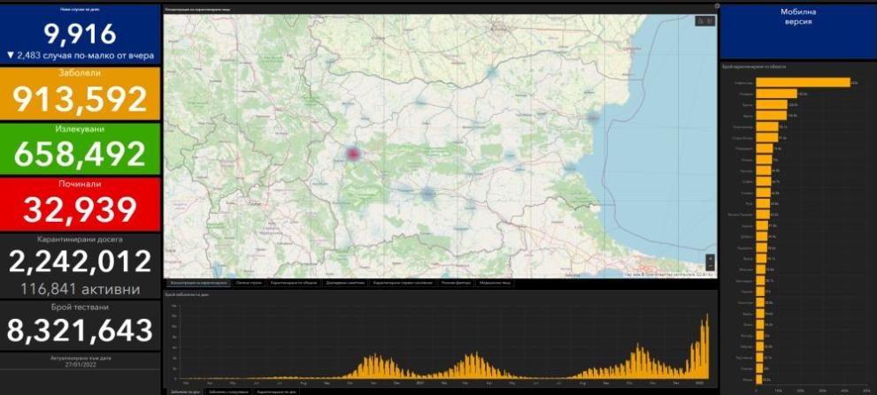 Онлайн може да се следи и разпространяването на COVID-19. От динамичните карти с настояща статистика излиза наяве, че максимален е броят на карантинираните в София град - 423 хиляди души, следвана от Пловдив със 183,5 хиляди души.