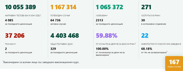 167 са диагностицираните с коронавирусна зараза за последните 24 часа - със 79 души по-малко от понеделник. Това демонстрира Националната осведомителна система.