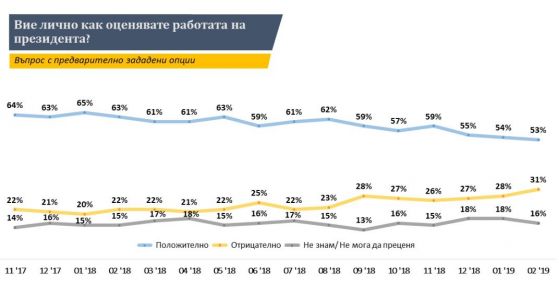 Това демонстрират данните от изследване на проучвателен център „ Тренд “ в интервала 5-13 февруари 2019 г. Проучването е финансирано от вестник „ 24 часа “ и е осъществено измежду 1007 респонденти чрез пряко полустандартизирано изявление „ лице в лице “. Размерът на статистическата неточност е ±3.1%. От " Тренд " прецизират, че по-голямата част от терена на изследването е изработен преди измененията в Изборния кодекс, които покачиха градуса на политическото и публично напрежение.