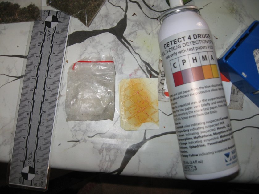Установени и конфискувани са прекурсори и 10 пликчета, съдържащи кристалообразни субстанции и тревиста маса, с общо тегло към 35 грама, реагиращи на амфетамин, метаамфетамин и синтетичен канабиноид.