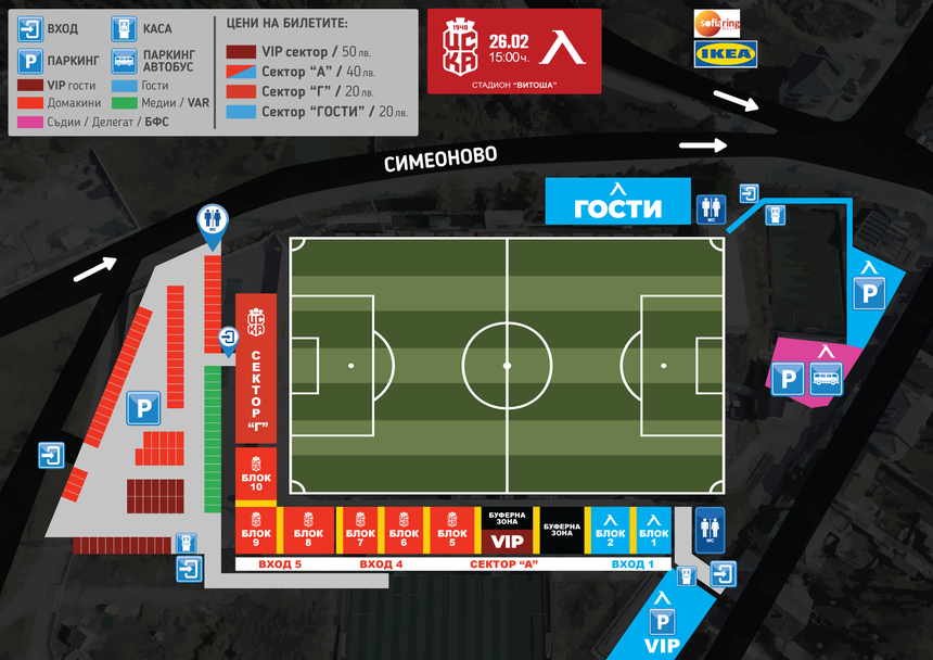 Публикуваме и скица на стадион „ Витоша “ с изобразени паркингите, касите, секторите, блоковете и входовете, отредени за почитателите на домакините и на гостите. На стадиона ще се позволяват последователи изцяло свободно без спомагателни условия, свързани с пандемията от COVID-19.