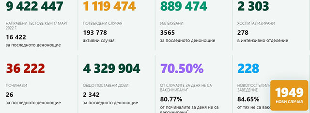 193 778 са дейните случаи все още. В болница са 2303 души, като в интензивните отделения се лекуват 278 индивида. Новопостъпилите в болнично заведение са 228, от тях 84,65% не са имунизирани.