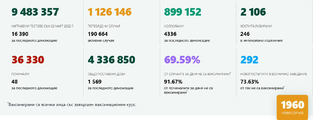 1 126 146 са общо случаите на ковид, доказани у нас все още. 190 664 от тях са дейни. 4336 са излекуваните лица за последните 24 часа.