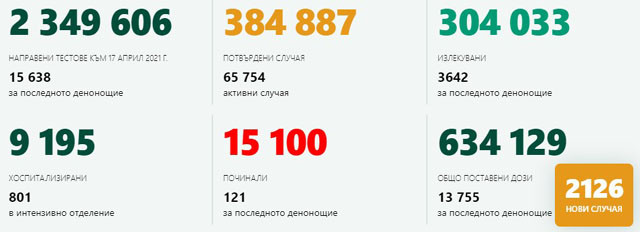 Поставените у нас дози от имунизациите против коронавирусна зараза са общо 634 129, 13 755 от които са сложени през миналите 24 часа. Националната осведомителна система демонстрира, че у нас медицинските чиновници с потвърден COVID-19 са общо 12 828. Новите случаи, регистрирани през последното денонощие, са 37. 15 100 са умрелите лица, при които е бил установен новият ковид. Нови 121 случая са регистрирани през последните 24 часа. Ден по-рано новодиагностицираните с COVID-19 у нас бяха 2185, а преди седмица, в петък - 2803.