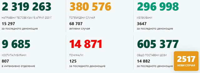 В България все още са сложени общо 605 377 дози от имунизациите против коронавирусна зараза, от които 14 882 са сложени през миналите 24 часа. Националната осведомителна система демонстрира, че у нас при 12 729 лица-медицински чиновници е доказан COVID-19. 59 нови случая са регистрирани през миналото денонощие. 14 871 са умрелите лица, при които е бил установен новият ковид. Новите случаи, регистрирани през последното денонощие, са 125. Преди ден новите случаи на COVID-19, открити у нас бяха 2944, а преди седмица, в сряда - 3556.